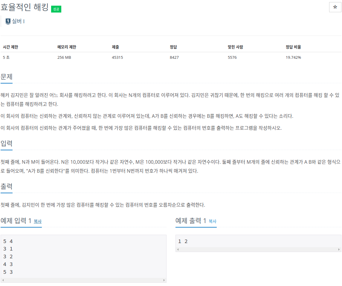 문제는 완전탐색 + 깊이 우선 탐색으로 해결했다. 시간 복잡도를 계산해보자. 각 노드에서 한번씩 탐색을 수행한 후 가장 많은 노드를 탐색한 시작점을 기록하는 것이다. 인접리스트로 이루어진 그래프를 깊이 우선 탐색하는 경우 V+E(노드의 개수 + 간선의 개수)이고, 여기서 V(노드의 개수, 완전 탐색)를 곱한게 시간복잡도를 나타낸다. 즉, 10,000*110,000 = 11억이다. 파이썬의 1초당 연산시간이 2000만번으로 알려져 있고(출처), 이는 대략 5초정도의 시간이 걸린다. 문제에서는 5초가 주어졌기 때문에 완전탐색으로도 풀 수 있는것이다.
