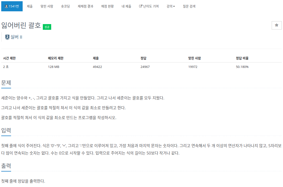 처음에는 \+와 \-의 패턴이 있을 것이라고 보고 \- 뒤에 오는 덧셈의 반복을 떠올렸다. 예를 들면 -1+2+1과 같이 \- 뒤에 덧셈으로 연속한 연산은 괄호로 묶어 음수로 바꿀수 있기 때문이다. 하지만 문제가 발생했다. 이렇게 표현하니 처음에 - 없이 바로 오는 덧셈을 잡지 못했다. 그래서 -가 앞에 오지 않더라도 덧셈이 반복되면 패턴이라고 보았다. 하지만 또 다른 문제 발생. -1과 같은 \-뒤에 숫자하나가 올때를 고려하지 않은 것이다. 그래서 그 기준도 추가해주었다. 마지막으로 앞에서 숫자하나만 등장하는 경우를 잡지 못해서 하나의 숫자가 앞에 있을때의 룰을 더해주었다.
