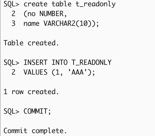 ▷t_readonly테이블을 정의하고 no에는 1, name에는 'AAA'를 가진 레코드를 삽입한다.