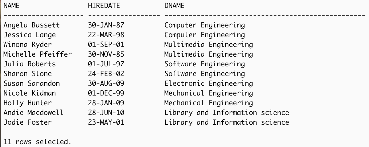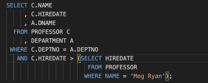 단일행 Sub Query일 경우 WHERE 절에서 사용되는 연산자Student 테이블과 department 테이블을 사용하여 'Anthony Hopkins'학생과 1전공(depno1)이 동일한 학생들의 이름과 1전공 이름을 출력한다.professor 테이블과 department 테이블을 조회하여 'Meg Ryan'교수보다 나중에 입사한 사람의 이름과 입사일, 학과명을 출력한다.