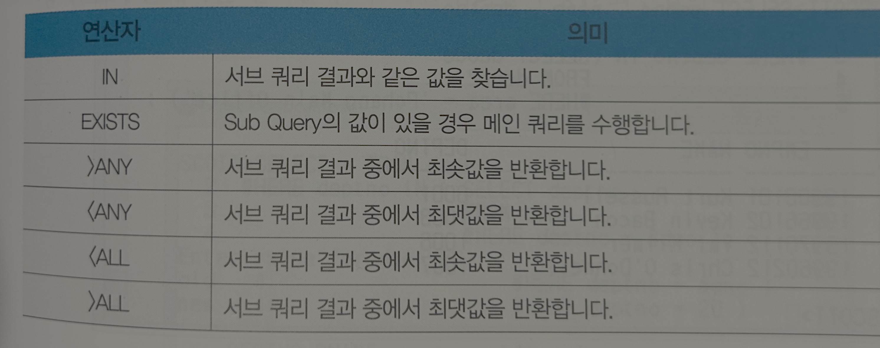 단일행 Sub Query와 다중행 Sub Query에 따라 연산자를 잘 선택해야 한다.