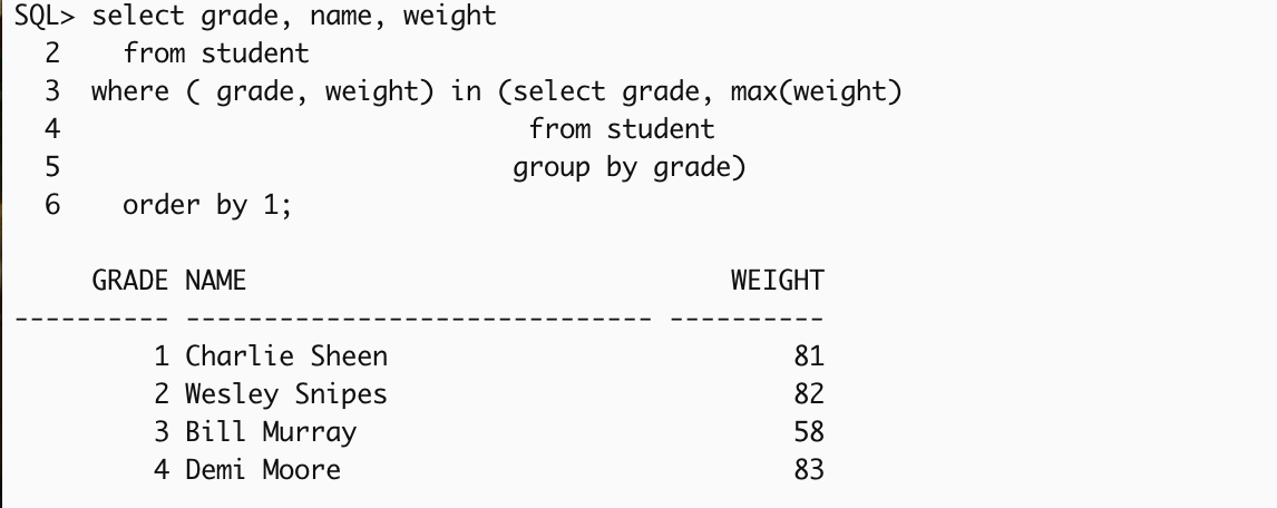 Student 테이블을 조회하여 각 학년별로 최대 몸무게를 가진 학생들의 학년과 이름과 몸무게를 출력한다.