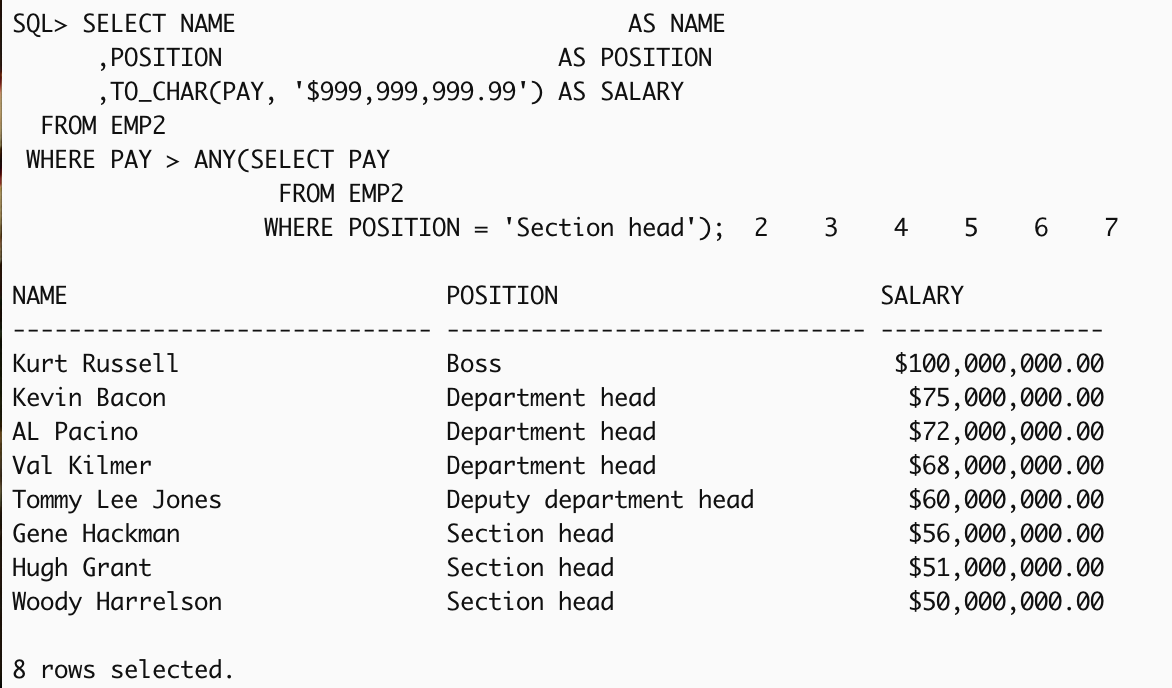 Sub Query의 결과값이 (100, 200, 300) 인 경우(예를 들어) SAL > ANY(100, 200, 300)이 되면 우변은 100(최소값)을 반환하고